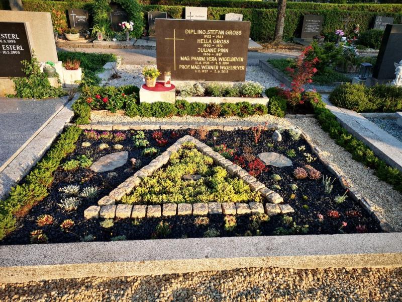 Thema war "Dreieinigkeit", von jeder Sorte wurden 3 Exemplare gesetzt, die natürlich zusammengewachsen sind. Innerhalb des Dreiecks auch mehr davon. Direkt vor dem Grabstein Wechselflor.