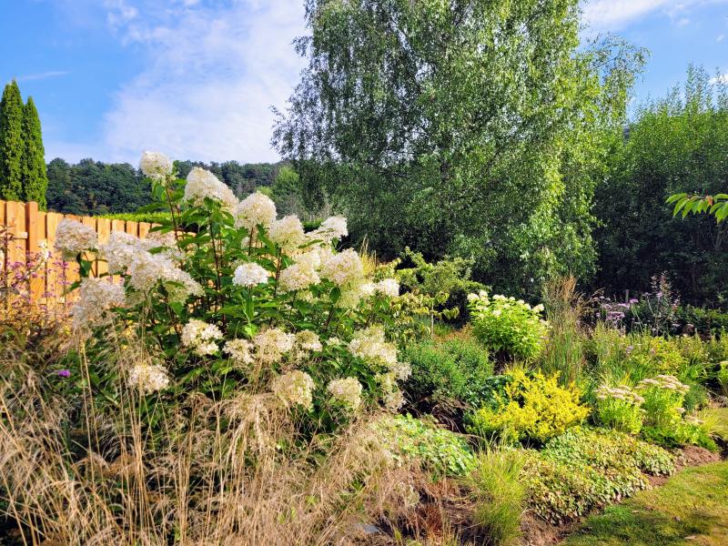 Das Strauchbeet wird nun von Hydrangea paniculata dominiert, die sich in den verschiedenen Sorten noch erstaunlich gut hält. Die übrigen Sträucher, allen voran Viburnum mariesii, leiden sehr. Wir haben gestern nach Ankunft dort direkt gewässert... :-[