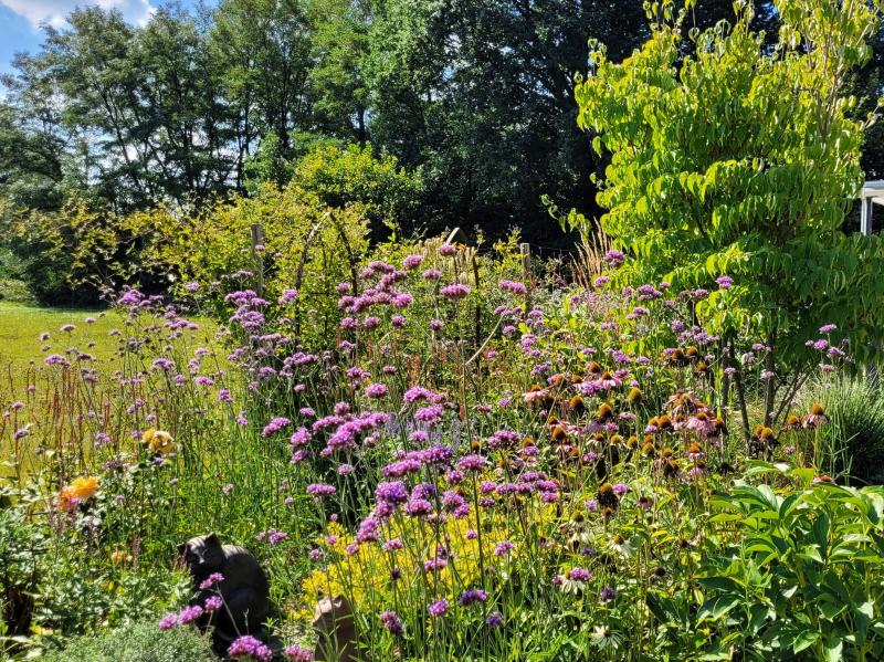 Rudbeckia 'Goldsturm' hatre eigentlich schon die Fahrkarte und sollte im Herbst eventuell durch die trockenheitsverträglichere Rudbeckia missouriensis oder Echinacea paradoxa ersetzt werden. Außerdem wuchert mir Goldsturm dort zu sehr aus. Ich hätte lieber die genannten Sorten, da diese horstig bleiben sollen. Aber nun staune ich, wie prächtig sich Goldsturm im Beet macht, scheinbar völlig ungerührt von der anhaltenden Trockenheit. Helenium hat schon überall im Garten komplett kapituliert... bis auf Kanaria.