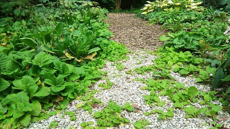 Interessant ist dass die Candelabra Priemel, aber auch die normalen Waldschlüsselblumen am liebsten im Splitt aufgehen. Man sieht hier dass in den Hackschnitzel keine Priemel aufgehen, auch in den Beeten daneben nichts.