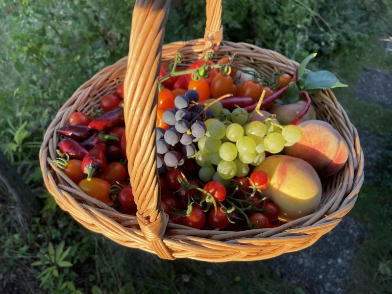 Heutige Ernte: Äpfel, Trauben mit Kernen für Saft, Tomaten, Pfirsiche, Minikiwis, Trauben ohne Kerne für Rosinen, Zucchini