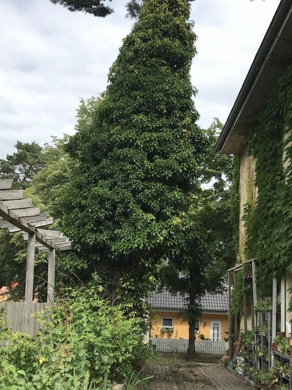 Efeu habe ich eine panaschierte Sorte an der Kiefer neben dem Haus, weil die nicht so doll wachsen sollte, allerdings vergrünt sie teilweise und wächst inzwischen auch recht heftig. Die Altersform wird dann doch sehr ausladend.