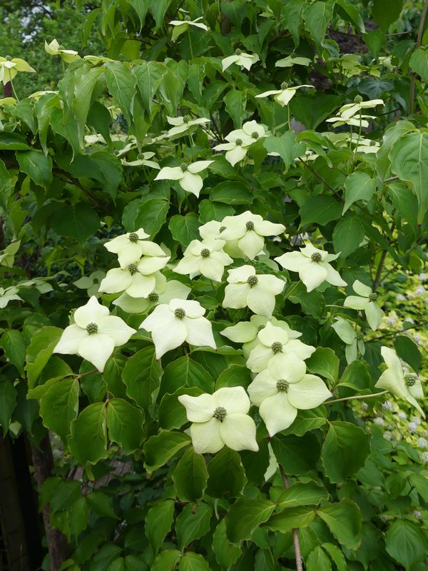 cornus kousa satomi, heute in der Morgensonne. Die Blüten wechseln die Farbe von weißgrün später zu rosa.