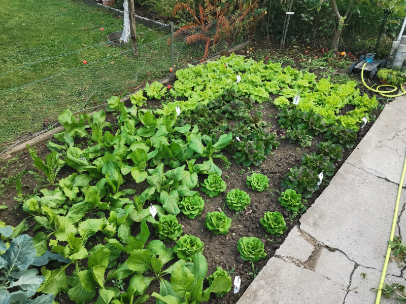 Catalogna ist ganz rechts hinten vorm Kohl der Block, der am wenigsten wächst. Vorne ist Unkraut, Löwenzahn der wieder austreibt.