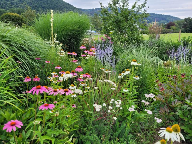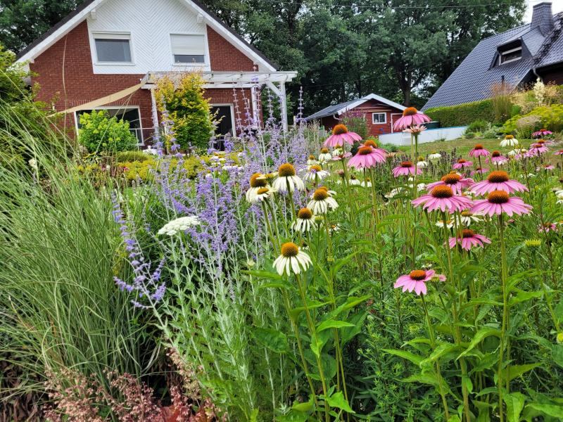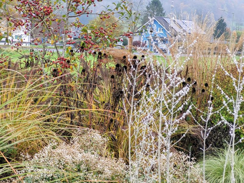 Im Steppenbeet habe ich vor 2 Jahren erst Perovskia atriplicifolia 'Little Spire' gepflanzt da diese breiteres, auffallend silbrig Laub hat und mit 80cm Höhe auch kompakter bleiben soll. Die Sorte lümmelt zurzeit allerdings etwas im Hintergrund herum, da sie nicht frei und sonnig genug neben einem Miscanthus steht. Ich werde es daher demnächst mittig im Beet mit ihr versuchen. Daher ist hier noch kein schönes Foto vorhanden.