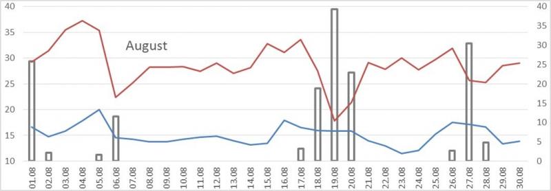 Hier war die Regenmenge nicht messbar, und als ich auf der Arbeit ankam, hörte das Getröpfel schon wieder auf. Immerhin, mit 24°C und einer frischen Brise bei teils blauem, teils wolkigen Himmel sind die Temperaturen nach langer Zeit endlich mal wieder angenehm. Hätte es das Gewitter am Wochenende nicht gegeben, wäre der August mit 8 mm Regen einer der trockensten in der Geschichte gewesen, so sind es "üppige" 26 Liter - nach dieser langen Dürre natürlich trotzdem viel zu wenig...