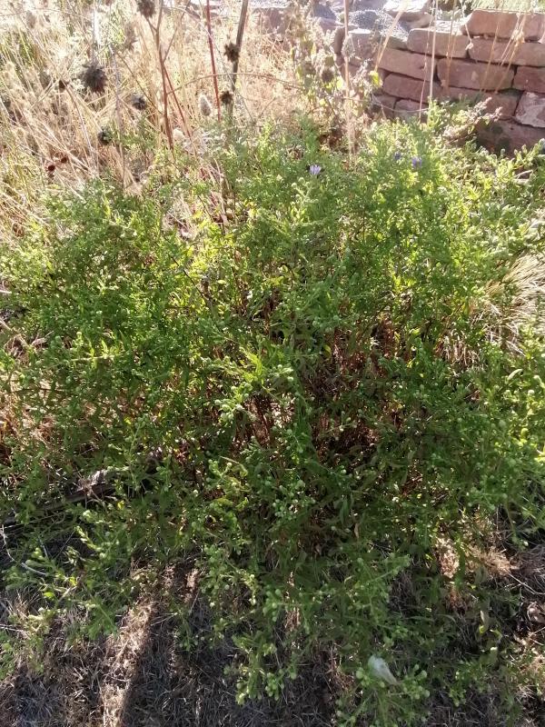 Mein Favorit: Aster oblongifolius "October Skies". Frischgrün im Gedörr rundrum. Sogar schon wenige Blüten offen.