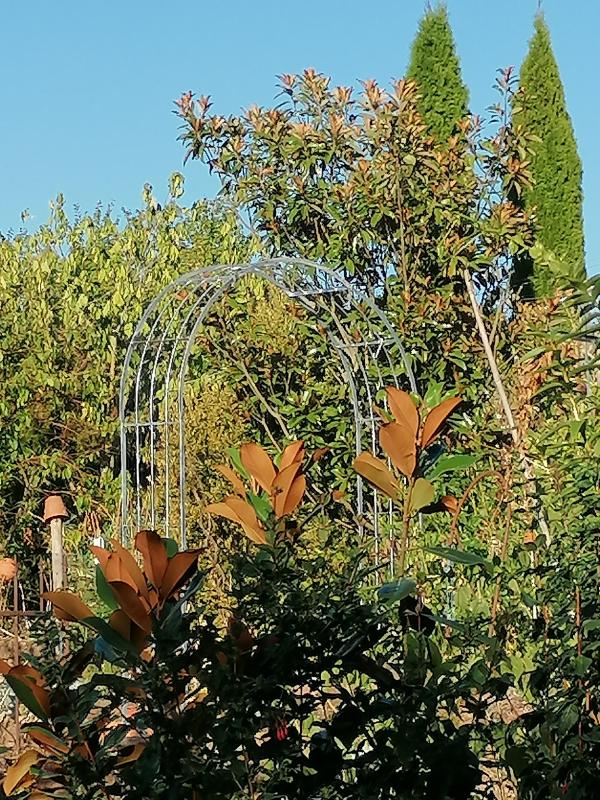 Und selbst in der grellen Abendsonne macht Magnolia grandiflora noch eine gute Figur (vorn Gallisionaire, hinten Alta)