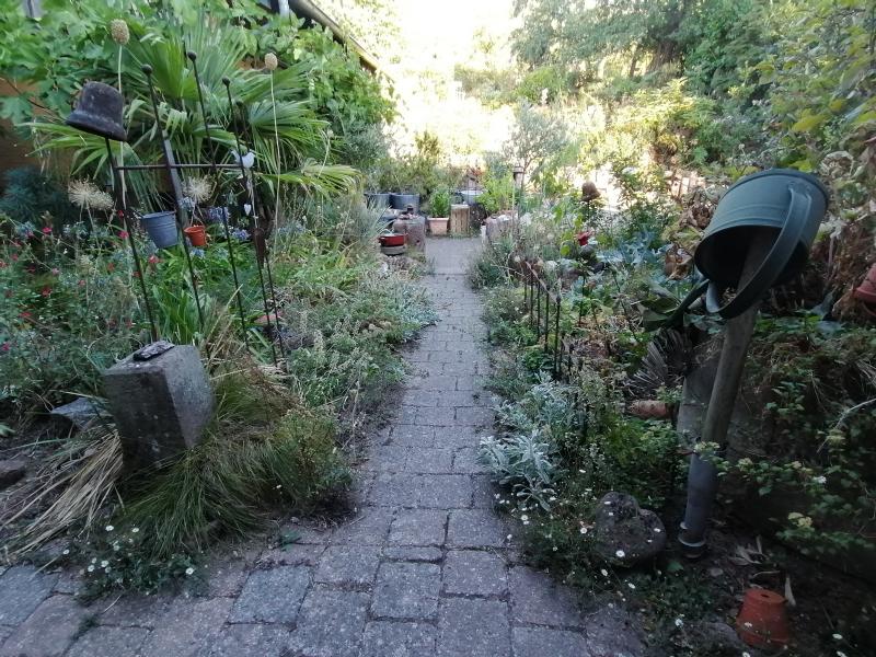 Mal oberflächlich drüberfotografiert vom Stuhl an der Hauswand sieht es trotz Dürre noch nach (wildem) Garten aus. Ich darf halt nicht so genau schauen 8)