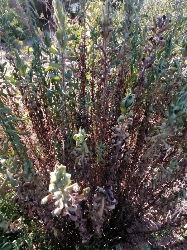 Leider hat sie hier sehr gelitten. Manche Triebe könnten noch eine Blüte schaffen, viele sind aber bis oben dürr.