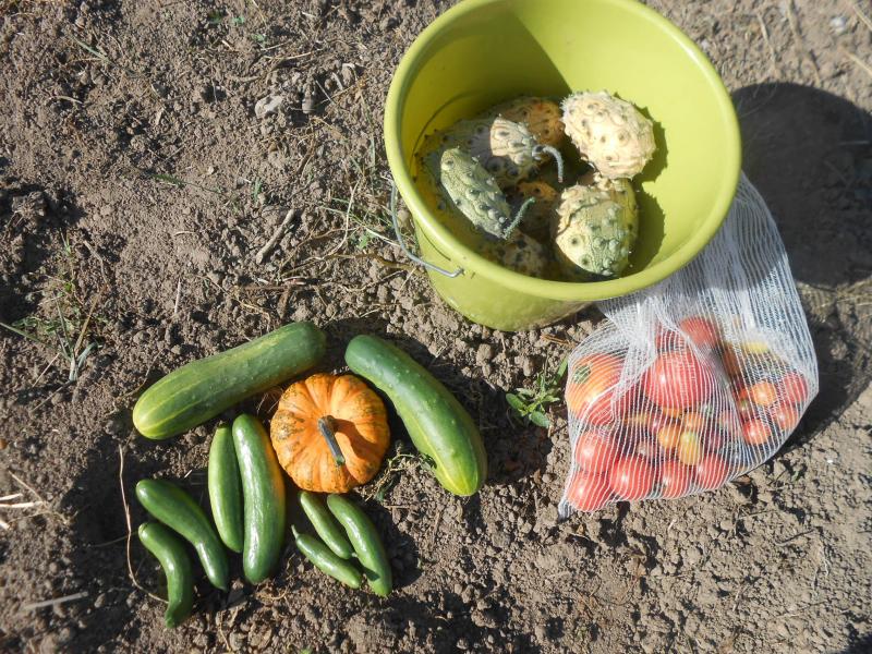 Herrliches Bild, Conny :D. Am Freitag habe ich das geerntet. Vorher hat es ein bisschen geregnet, mal sehen wie die beiden Salatgurken schmecken. Es könnte auch an der Sorte liegen, die mikrigeren aus dem Garten waren nicht so bitter. Allerdings sind sie das normalerweise nur an den Enden und nicht durchgängig.