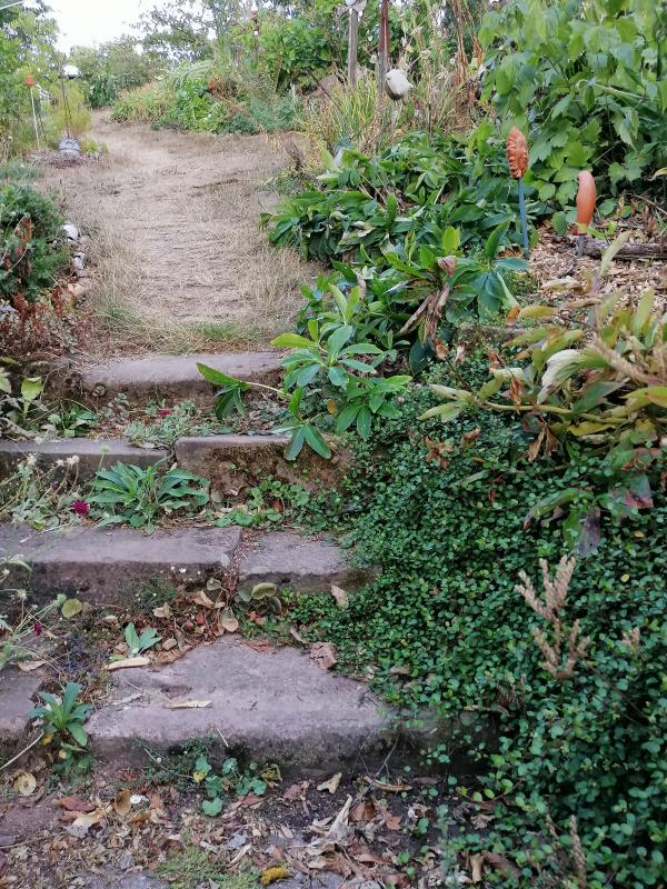 Mal oberflächlich drüberfotografiert vom Stuhl an der Hauswand sieht es trotz Dürre noch nach (wildem) Garten aus. Ich darf halt nicht so genau schauen 8)