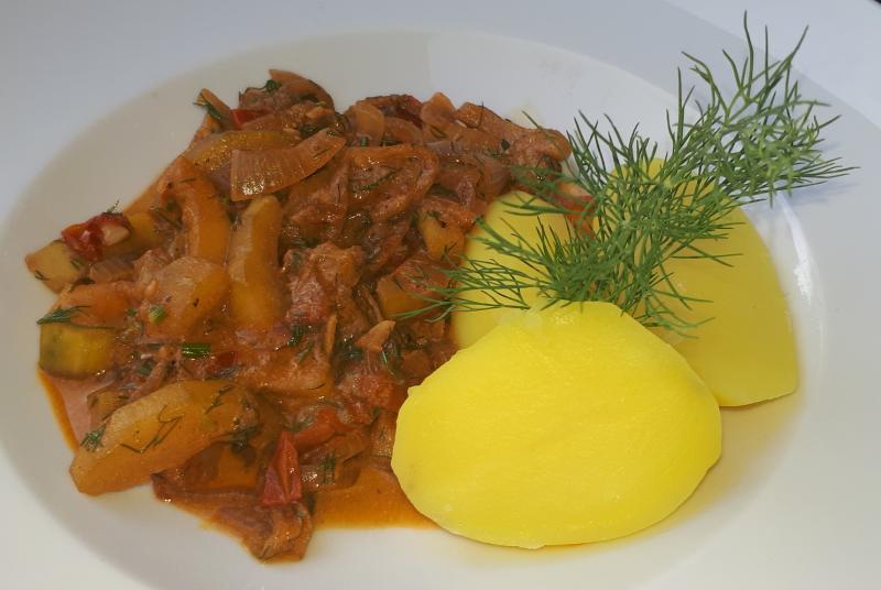 Schmorgurken und -zucchini mit Zwiebeln, Tomaten, Knoblauch und saurer Sahne und Kartoffeln, Chinakohlsalat aus dem Garten