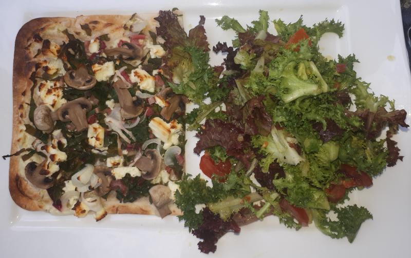 Flammkuchen mit Mangold, Champignons, Zwiebeln und Schafskäse, Salat