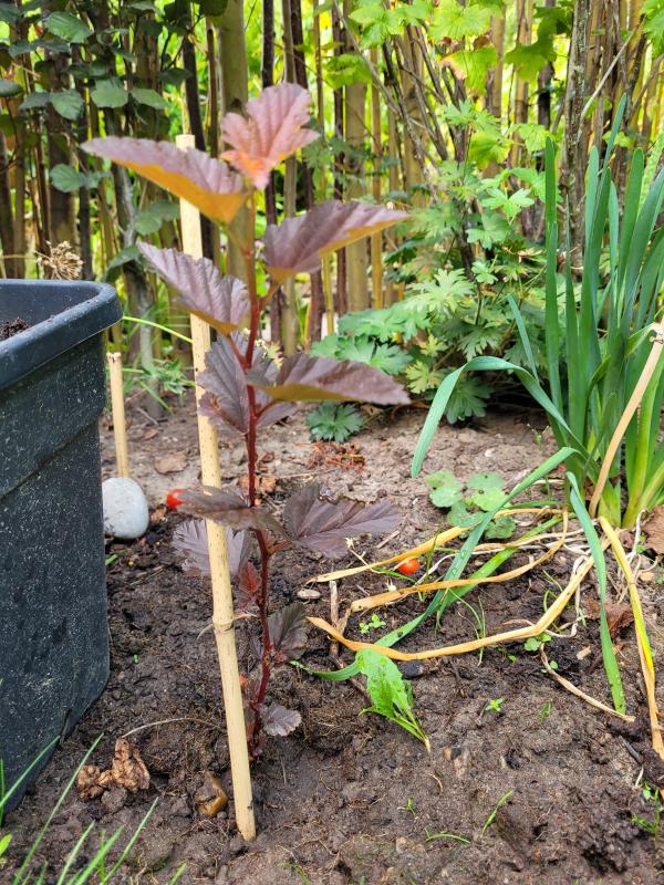 Ich habe mich sehr gefreut, dass unsere recht trockenheitsresistente Blasenspiere Sämlinge hatte. Der eine bekam etwas Fünger an die Füße, der andere in einen Topf.