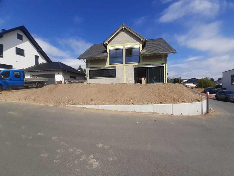 Ich gebe ja zu, mich inspiriert es auch nicht so richtig, aber Sohn und Schwiegertochter wollten es so haben. (Ich hätte vermutlich die Gesamtanlage anders gemacht.) Stufenweise mit L-Steinen abfangen war nicht erlaubt, mehr als 1 Meter wurde nicht genehmigt.