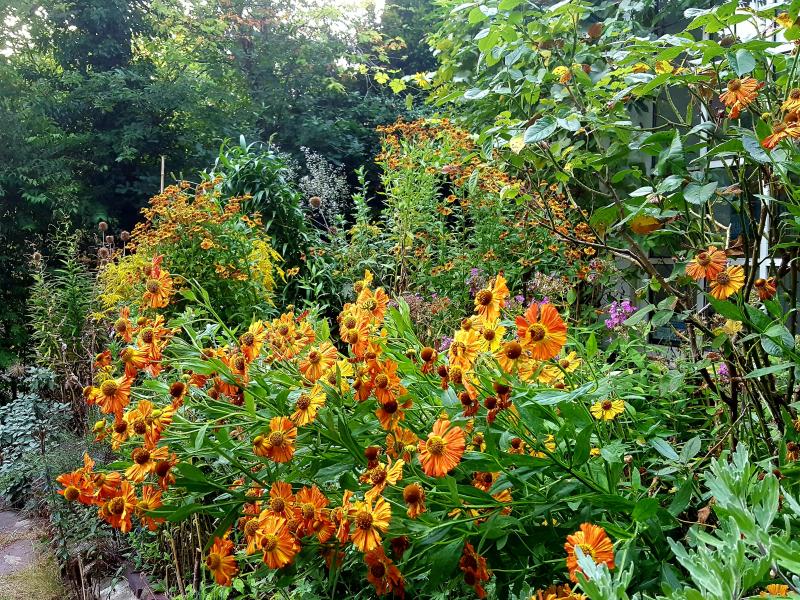 Wind und Trockenheit zwingen die hohen Heleniumhorste so langsam in die Kniee.