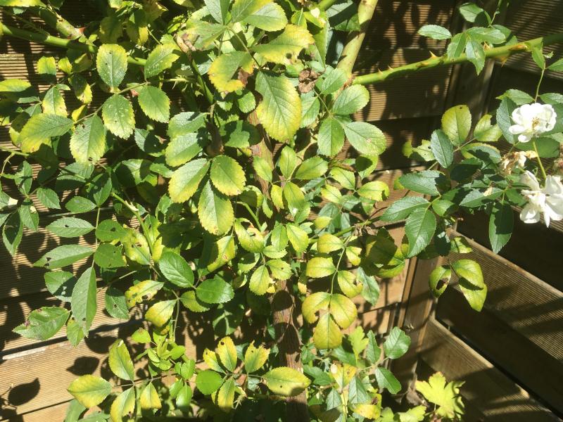 Hallo,ich habe hier eine kleine, sehr weichtriebige Kletterrose. Sie sieht aus wie eine Ramblerrose, hat 10 dünne Triebe. Sie ist auf der rechten Seite normalgrün. Auf der linken Seite sind die Blätter jedoch hellgrün und man sieht die Äderchen. Ich denke mal es ist Eisenchlorose. Aber warum sind nicht alle Blätter so gelbgrün?Und was kann ich dagegen tun?LGblumenmaid