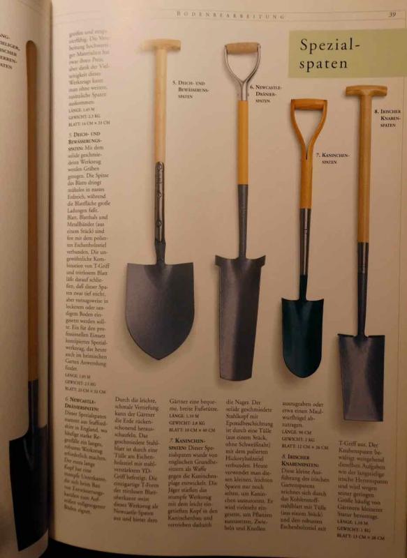 Ja, in dem Werk von William Bryant Logan werden Standardspaten, Langstielspaten, Spezialspaten, Grabespaten und schwere Spezialspaten jeweils mit Bildern beschrieben, natürlich aus britischer Sicht. Das deutsche Buch geht nur sehr oberflächlic auf die verscheidenen Grabegeräte ein.