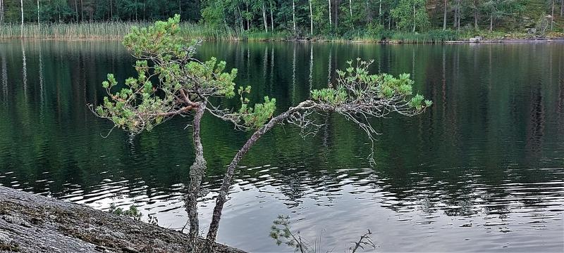 In diesem Sommer ist mir im finnischen Seengebiet zum wiederholten Mal aufgefallen, wie schön die Kiefern sind, die sich über Jahrzehnte auf Felsen, in winzigen Spalten, halten und kaum Zuwachs zeigen. Da einige Fotos der Schwiegereltern und Großelterngeneration zeigen, wie alt diese Exemplare sind, staunt man in Ehrfurcht über Überlebenswillen, Durchhaltevermögen und Durchsetzungskraft. Knorrige und skurril-graphische Schönheit erinnert an Bonsai; und wenn man sich über die verschiedenen Bonsai-Stile und Gestaltungsmöglichkeiten informiert, wächst die Achtung vor diesen Naturschönheiten.