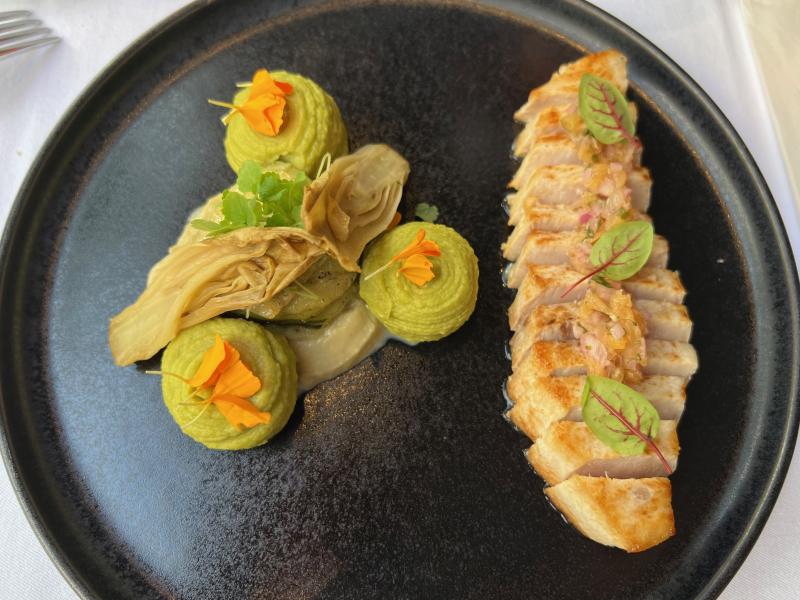 ... haben wir / hat sich Nina heute daran gemacht. Saiblingsfilet mariniert in Orangenabrieb und Orangensaft, etwas Tomaten-Zwiebel-Concasee, dazu Püree von dicken Bohnen mit etwas Thymian und Zucchini-Scheiben mit Tomaten. Das kam dem Vorbild schon recht nahe!