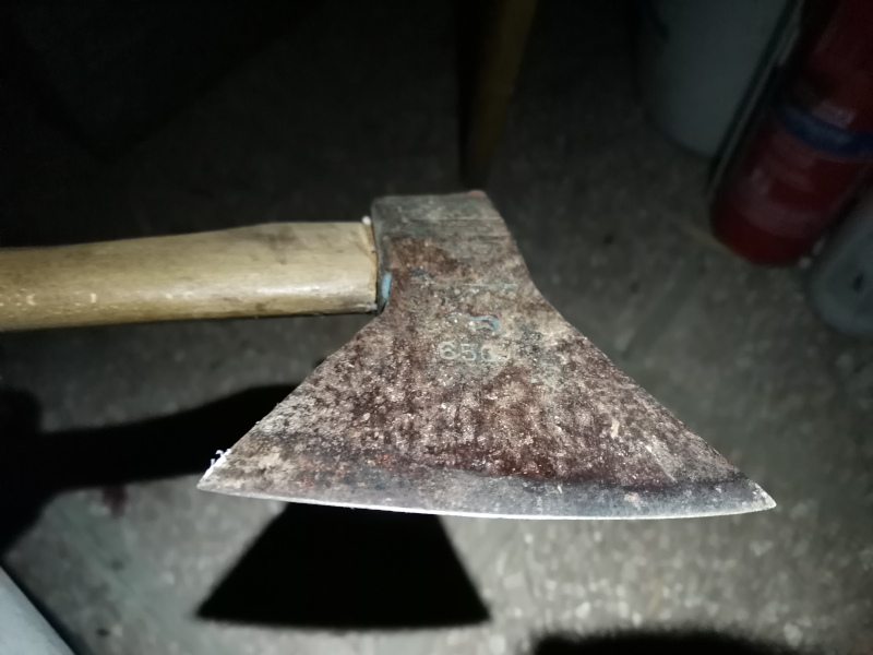 Beil/Axt schärfe ich persönlich so: relativ spitzer Winkel hinter der Schneide für guten Durchgang, ganz vorne die letzten 1-2mm recht flacher Winkel wegen der Schnitthaltigkeit (dort glänzt es auf dem Bild).