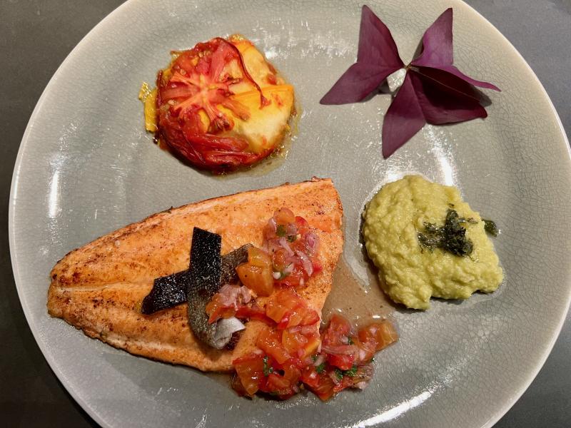 ... haben wir / hat sich Nina heute daran gemacht. Saiblingsfilet mariniert in Orangenabrieb und Orangensaft, etwas Tomaten-Zwiebel-Concasee, dazu Püree von dicken Bohnen mit etwas Thymian und Zucchini-Scheiben mit Tomaten. Das kam dem Vorbild schon recht nahe!