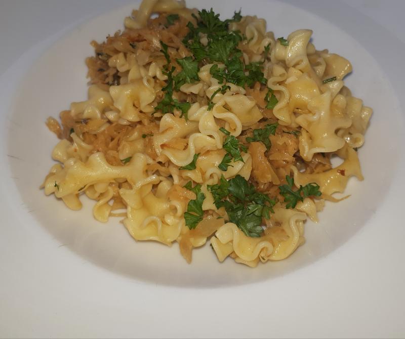 Gebratenes Sauerkraut mit Pasta, dazu geriebenen Parmesan und Bergkäse