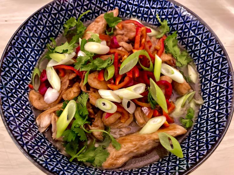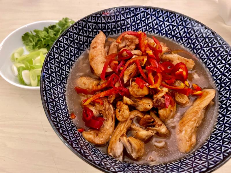 hier crossover-asia-nudelsuppe mit gebratenen hühnerfleischstreifen (zum abschluss sojasauce dazu) und etwas gartenchili… 8)