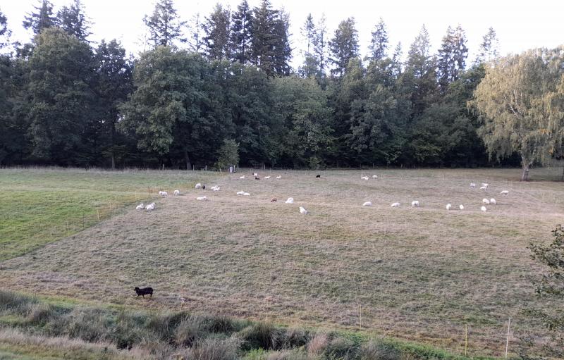 Also oben gemäht, auf der anderen Bachseite gemäht. Über den Bach gezäunt. 17.30 die Schafe rüber geschickt, ca. 19 Uhr wieder in die sichere Hälfte zurück geholt. Da waren sie kugelrund gefressen ;D