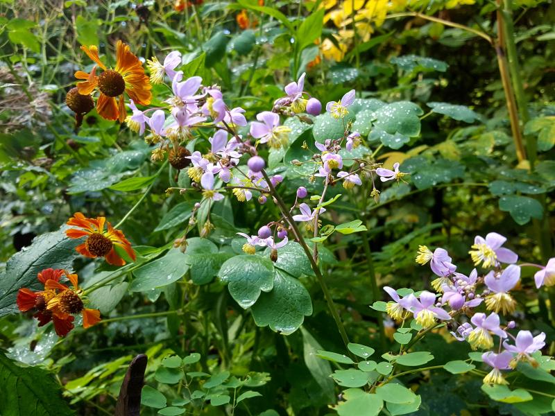 Hier blühen die letzten Wiesenrauten und Helenien oben ....