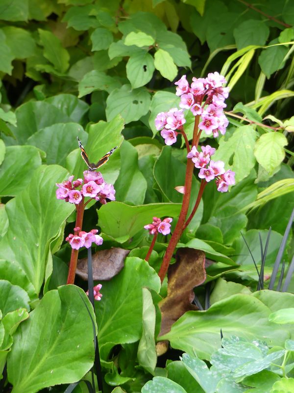 Hier blühen jetzt nochmal die Bergenien ('Doppelgänger' oder 'Herbstblüte').