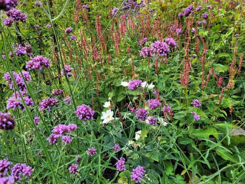 Während die Rudbeckien nun in den letzten Zügen liegen, dreht Aster 'Asran' im Hintergrund nun voll auf. Zwar ist sie an dieser Stelle im Halbschatten unter der Tanne nicht besonders standfest, aber so produziert sie einen "Wall" aus Blüten, die dem Garten einen schönen Rahmen geben. Der Blutweiderich am Teich macht seinem Namen nun alle Ehre, Laub und Stängel färben sich blutrot und ergänzen schön den kleinen Acer palmatum 'Dissectum'.