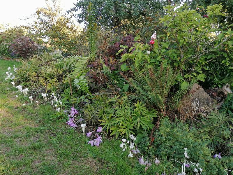 Stark gebeutelt dieses Jahr. Monatelang keinen Regen, jetzt viel Regen und heute früh haben die 0 Grad angeklopft. Die Wiese wird erst ganz langsam wieder grün. Ein paar rosa Colchicum hat der Frost oder die Nässe erwischt. Die weißen (C. autumnale "Album") sind noch ok.