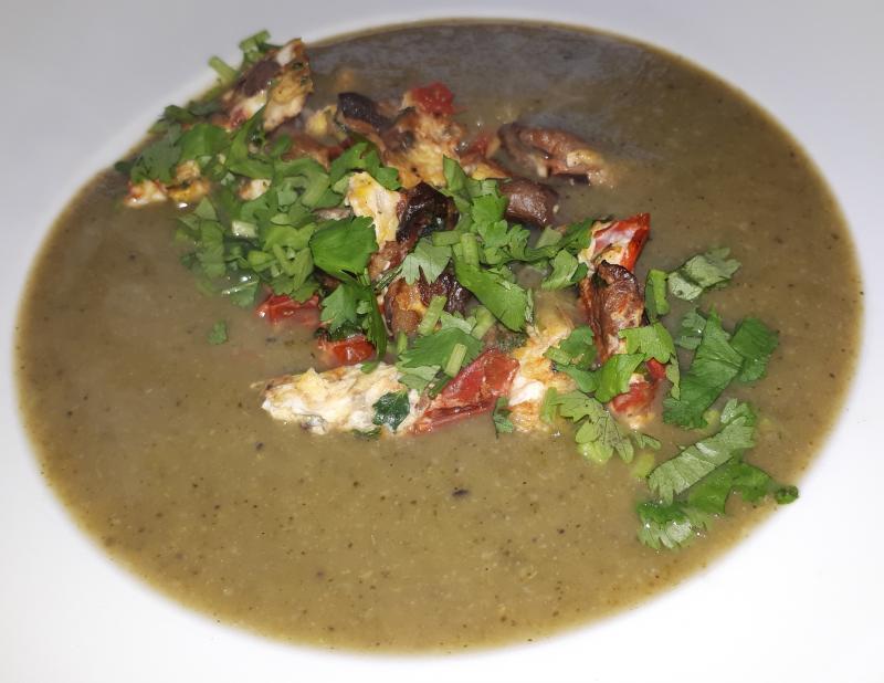 Grüne Suppe (Brokkoli, Zucchini, Chinakohl, Pak Choi) mit Pilz-Tomaten-Koriander-Rührei