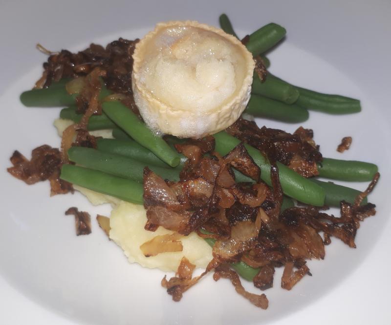 Kartoffelstampf, Gartenbohnen, braune Zwiebeln und Ziegenkäsetaler