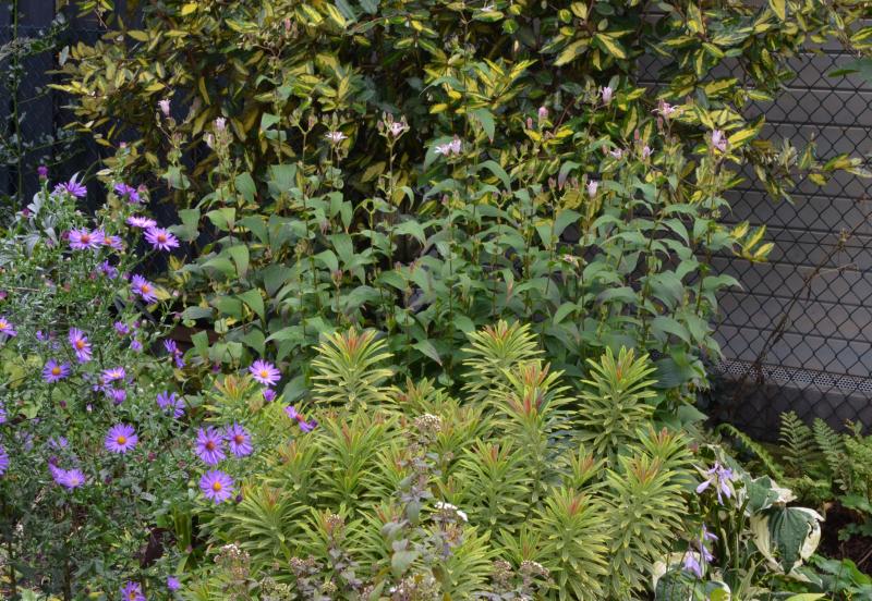 Im Vorgarten blüht noch die letzte Stockrose mit Phlox und Herbstanemonen