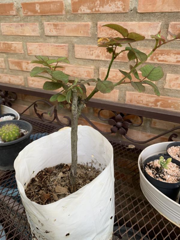 Wenn ich mir die nach oben klaffende "Veredelungsstelle" ansehe scheint das Reis oder Auge von unten reingeschoben zu sein. Vielleicht auch nur ein Schlitz und seitlich reingeschoben? Sieht, falls es kein Steckling ist, aber verletzungsanfällig aus.
