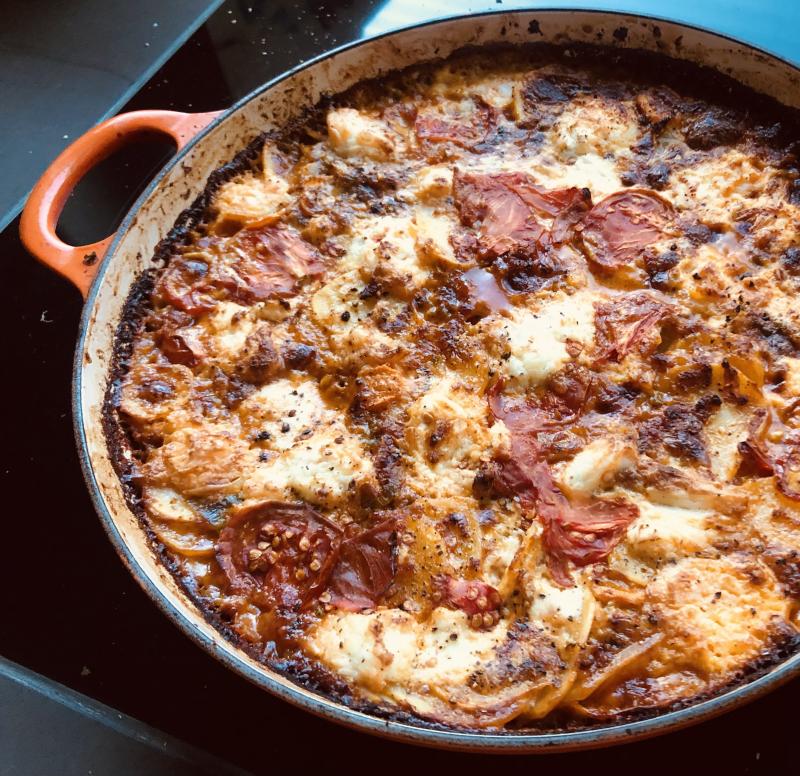 Ich habe heute Zwiebeln und Knoblauch mit Corned Beef und Tomatenmark angeschwitzt und mit Weißwein und Wasser abgelöscht. Es kam noch etwas Petersiliestängel, Lauch und Möhren klein geschnitten und einige gehobelte Kartoffeln dazu. Oben drauf noch Burrata (Mitte August gelaufen) und dann noch für 30 Minuten in den Ofen. Es hat sehr gut geschmeckt. :)