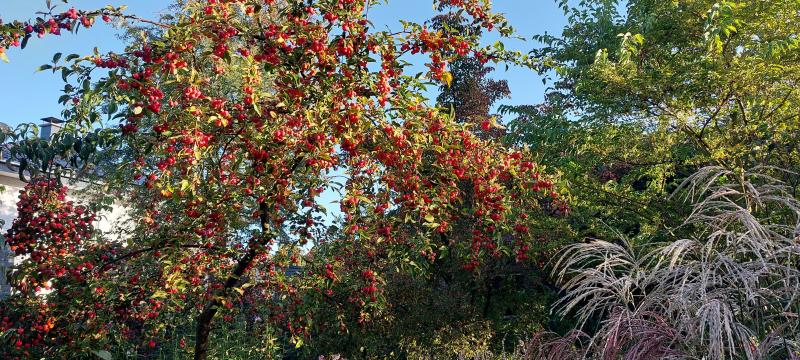 Kaunis, wow, dein Zierapfel und der Cornus tragen ja eine Menge Früchte. Das Rot der Früchte ist ein Hingucker. :D