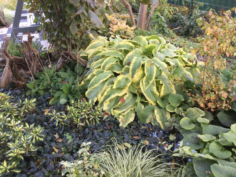 Auf dem Schattenhügel zeigen die Hostas herbstliche, gelbe Farbtupfer