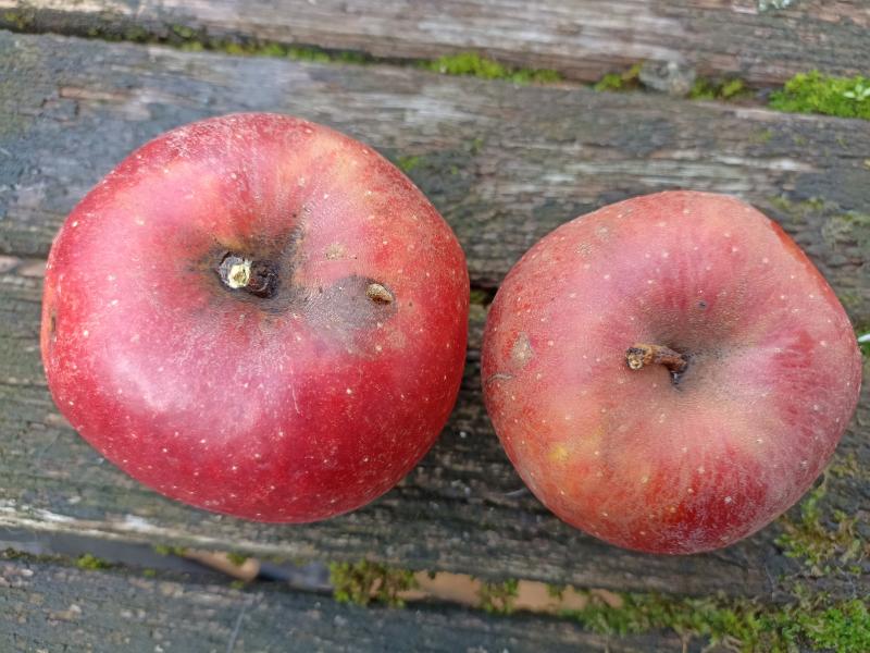 Der größere der beiden Äpfel, der linke, ist 8 cm breit, 7 cm hoch, viele helle Lentizellen, die Schale ist leicht rauh, von allen Seiten rotschalig und auch nicht bereift oder wächsern.