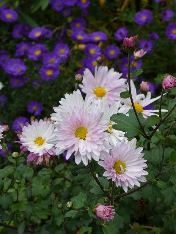 'Mary Stoker' gehört zu den früheren Sorten, wird an ihrem Platz leider sehr hoch. Ich sollte im nächsten Jahr versuchen, ob Pinzieren im Sommer zu niedrigeren Blütenständen führt. 'Tina' bleibt schwach, weil sie, wie einige andere Winterastern auch, im Austrieb stark von Schnecken heimgesucht wurde. 'Herbstkuss', von Irm bekommen, ist wie immer zuverlässig und üppig. - 'Duchess of Edinburgh' 'Weserstein' blüht seit Wochen. 'Anastasia' hat früh begonnen, verharrt jetzt aber schon einige Zeit.