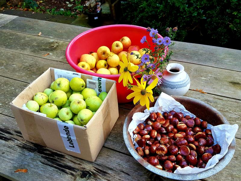 Fallobst vom Rasen aufgelesen ( Zuccalmaglio ), Eßkastanien gesammelt.