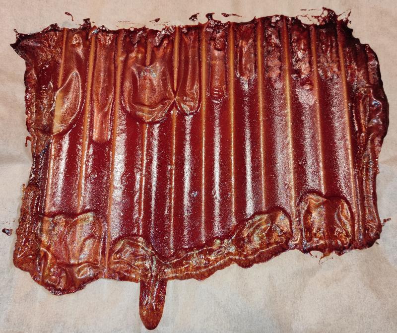 Ich hatte ja zum Glück nur sieben Quitten. Hat für sieben Gläschen Quittengelee gereicht und den Rest habe ich durch das Sieb gestrichen und zu Marmelade mit 1:3 Einmachzucker gemacht. Letztes jahr hatte ich aus den Resten mit etwas Zitronenzesten auch so ne Art Quittenleder gemacht. Das ging weg wie geschnitten Brot. Leider weiß ich nicht mehr so genau wie ich das gemacht hatte, also was für und wieviel Zucker. Jetzt hatte ich noch ein Gläschen gefunden und das kurzerhand auf Backpapier gestrichen und immer die Restwärme vom Backen draufgegeben. Anders aber auch lecker.