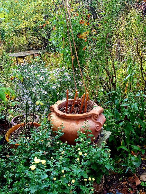 Knospige Chrysanthemen, blühende Astern, verblühte Helenien , herbstlicher Garten im Hintergrund.
