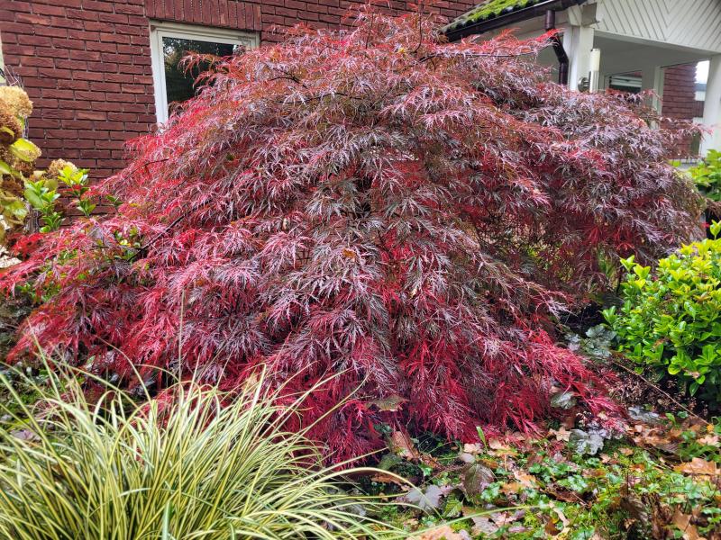 Aber am späteren Nachmittag kam heute die Sonne sogar etwas raus und es wurde merklich wärmer. Also nichts wie raus... und erst einmal die beginnende Rotfärbung des Acer dissectum 'Garnet' im Vorgarten festgehalten, bevor er durch den Regen bedingt eventuell 'gar net' mehr vollständig zum Ausfärben kommt. ;D