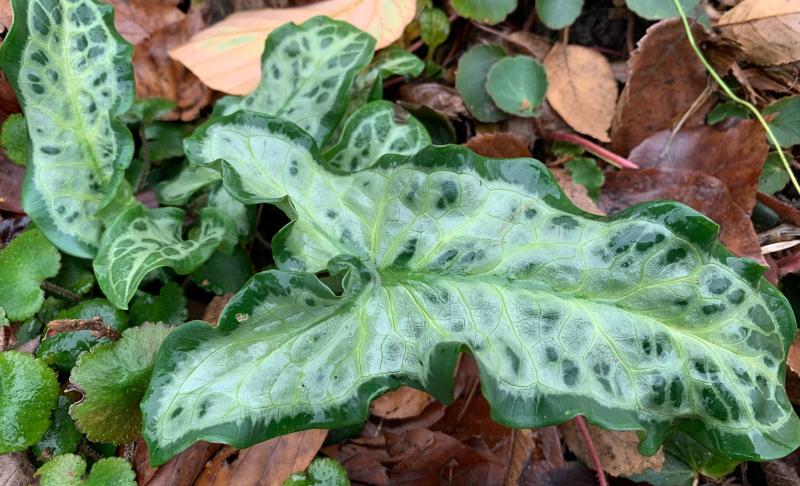 ‚Spottend Jack‘ hat sich gut entwickelt und taucht an verschiedenen Stellen im Garten auf. Er gehört zu den kleineren Arum italicum.
