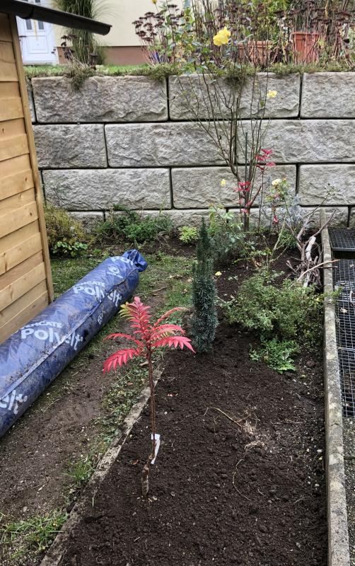 Jetzt werde ich mal den Sorbus und die Eibe einpflanzen und schauen, was platzmässig dazwischen noch passt. Ich hätte noch einen Vitex agnus castus, einen kleinen Granatapfel und ein Mittelmeerschneeball- Bäumchen irgendwann unterzubringen….🤔