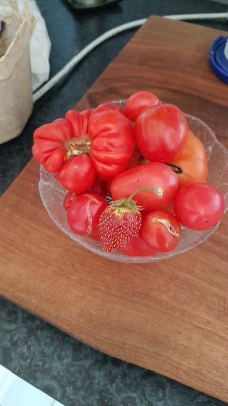 Die Schale hat meine bessere Hälfte letzten Sonntag geerntet. Die Tomaten wollen unter dem Dach den Wintererbsen noch nicht weichen.